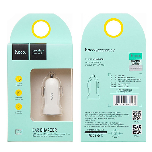 Адаптер Автомобильный Hoco Z2 1USB/5V/1.5A (white)