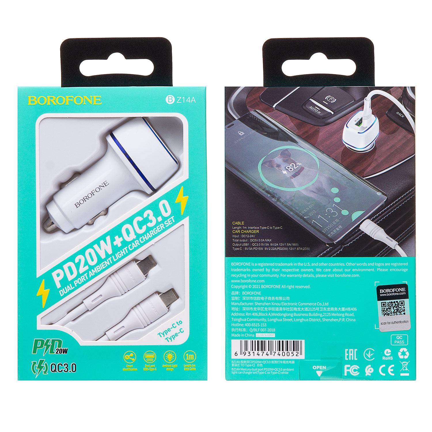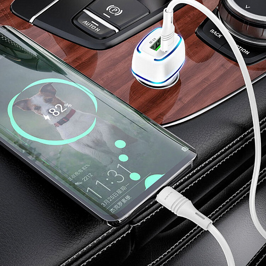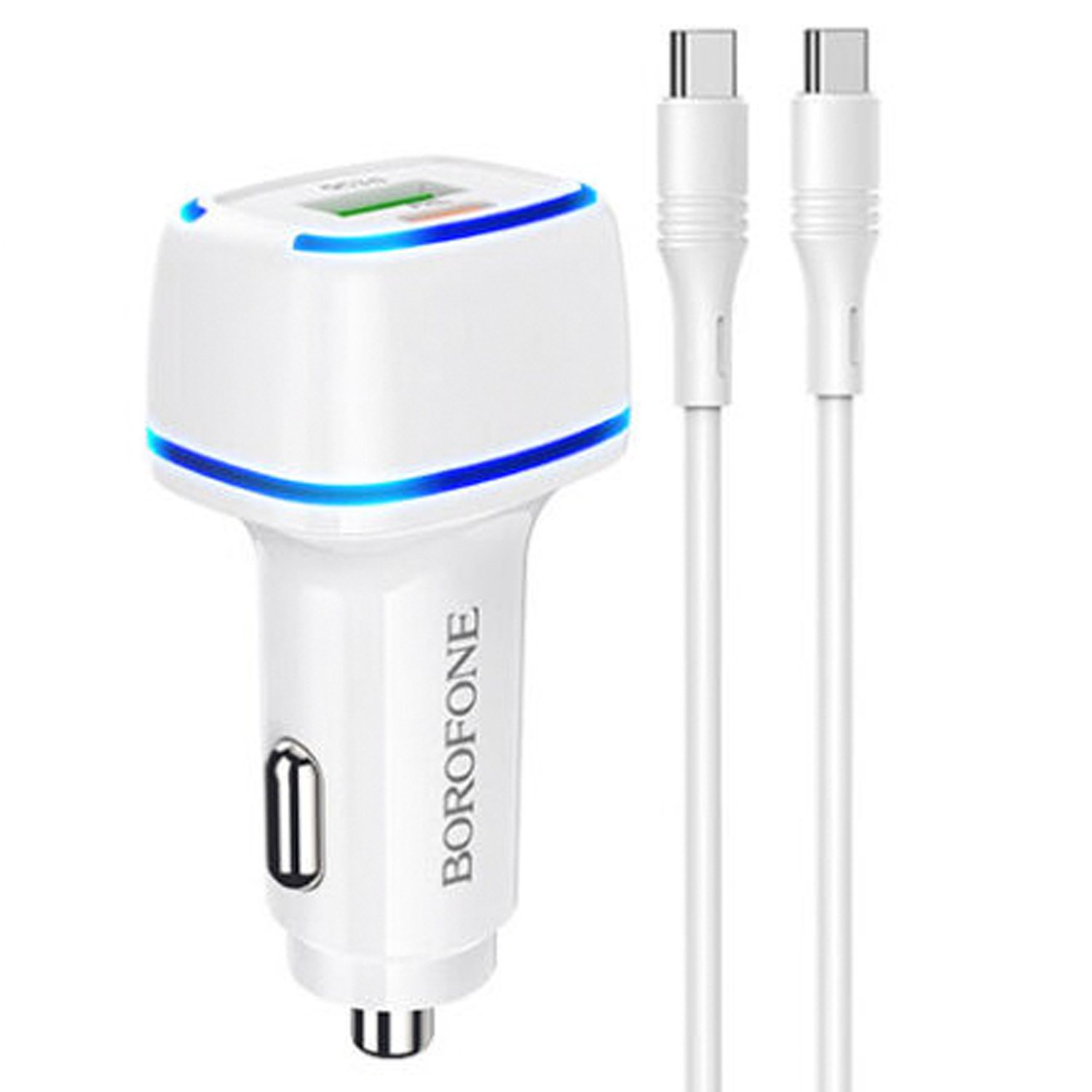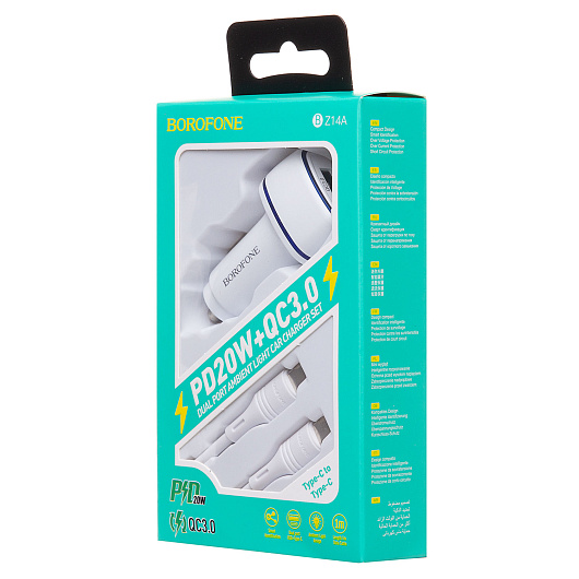 Адаптер Автомобильный с кабелем Borofone BZ14A Mercury USB/Type-C/5V/3.4A PD+QC3.0 Type-C/Type-C (white)