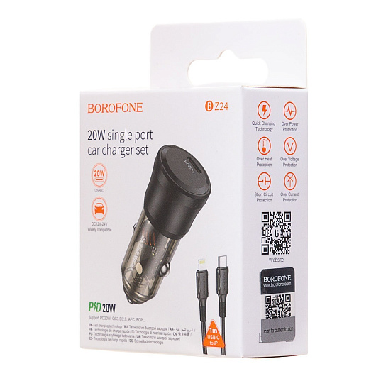 Адаптер Автомобильный с кабелем Borofone BZ24 Clever PD20W Type/C/5V/3A (Type-C/Lightning) (transparent black)