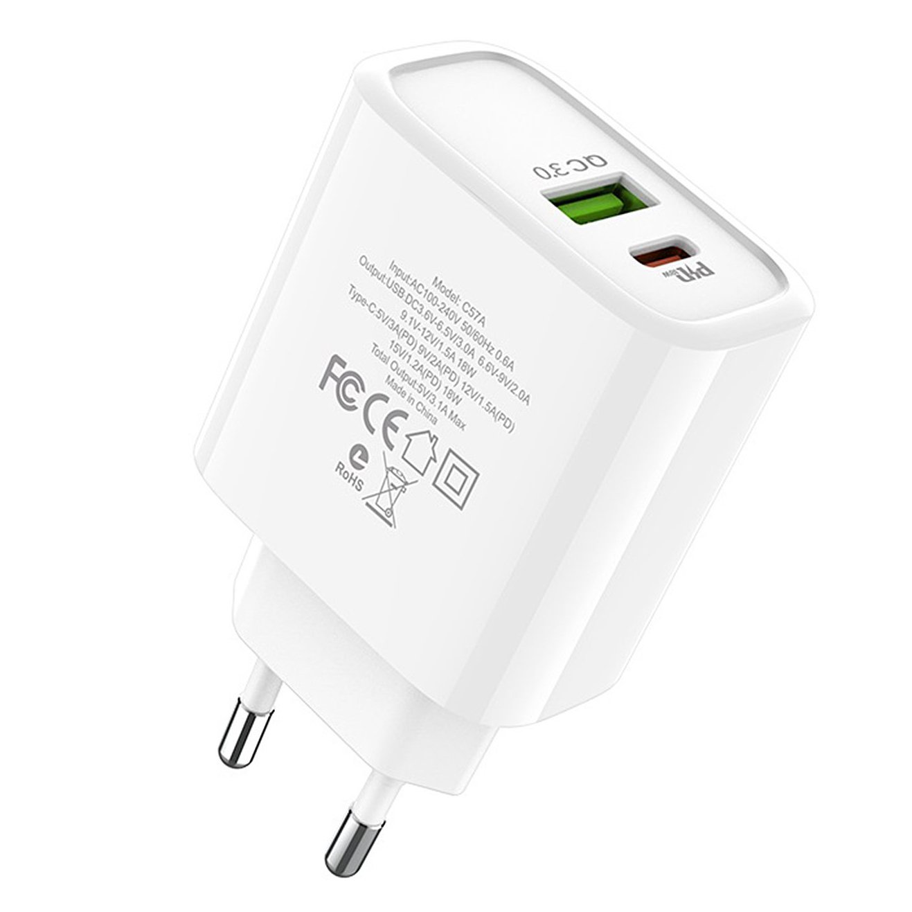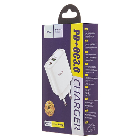 Адаптер Сетевой Hoco C57A Speed PD QC3.0 USB/Type-C 3A/20W (white)