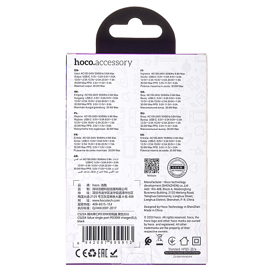 Адаптер Сетевой Hoco CS22A Value PD Type-C 30W (black)