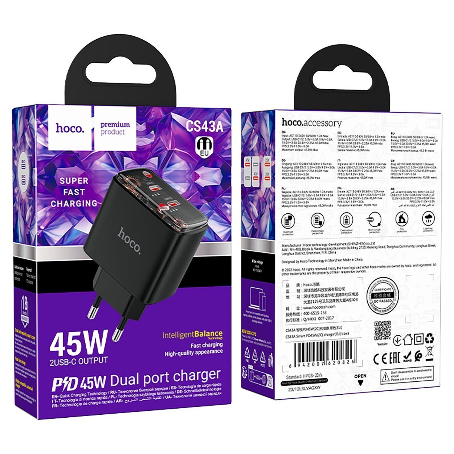Адаптер Сетевой Hoco CS43A Smart 2*Type-C 45W (black)