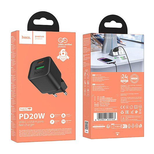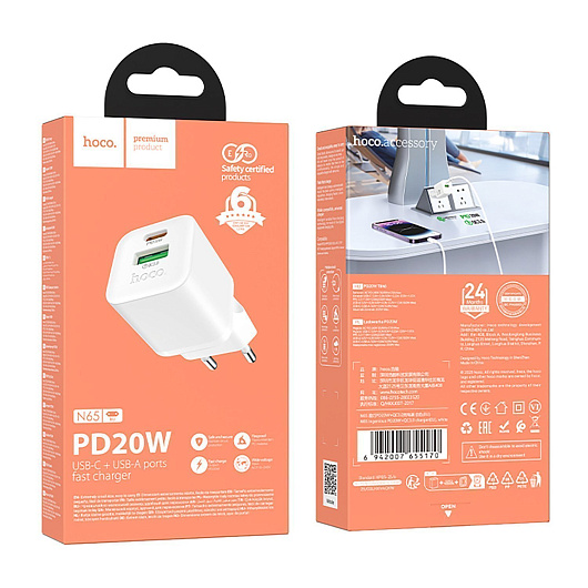 Адаптер Сетевой Hoco N65 PD+QC3.0 USB/Type-C 3A/20W (white)