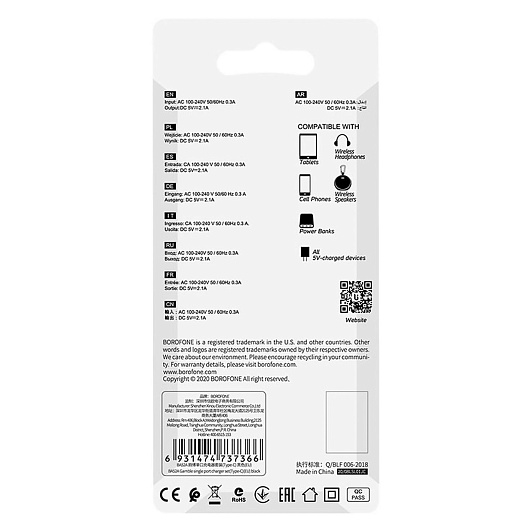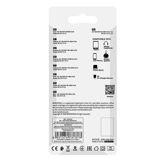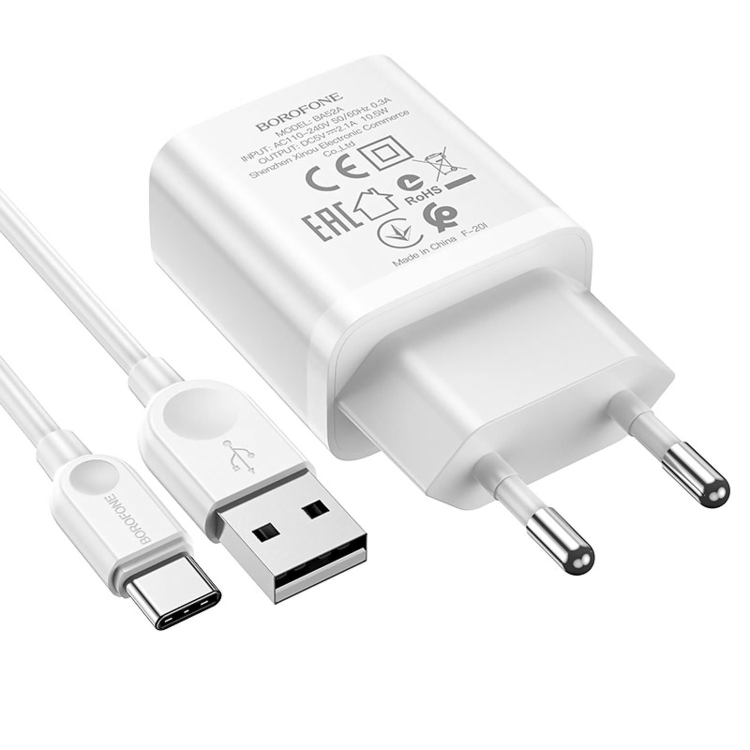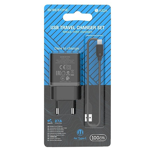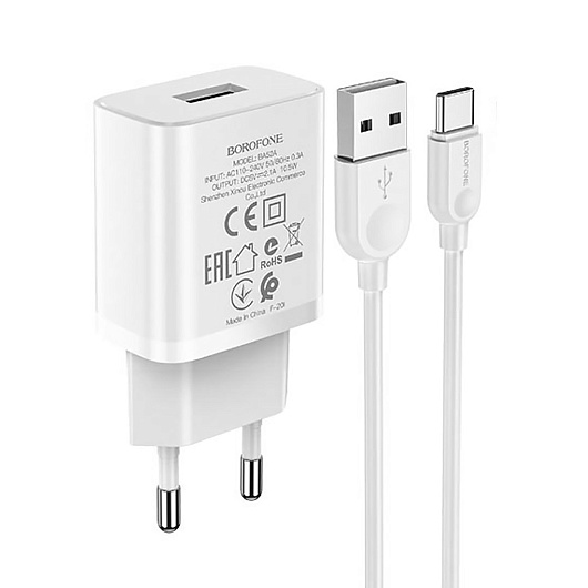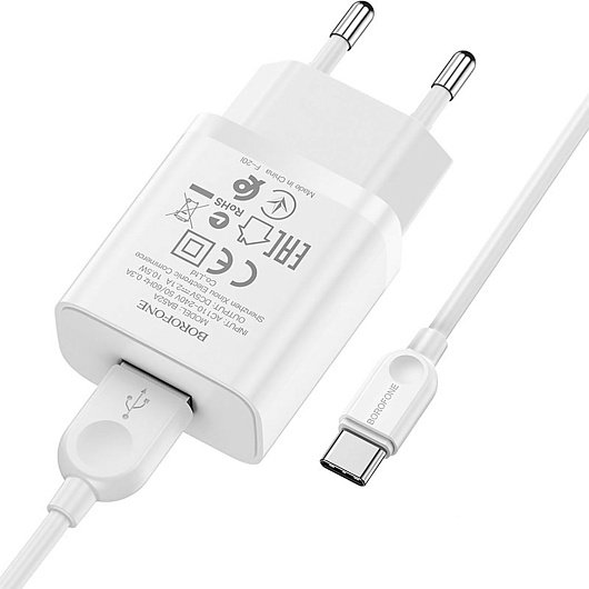 Адаптер Сетевой с кабелем Borofone BA52A Gamble USB 2,1A/10W (USB/Type-C) (white)
