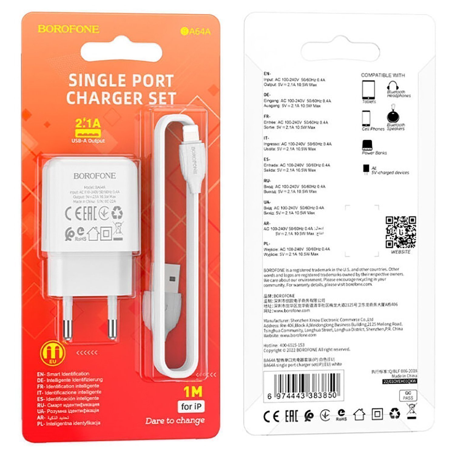 Адаптер Сетевой с кабелем Borofone BA64A USB 2,1A/10W (USB/Lightning) (white)