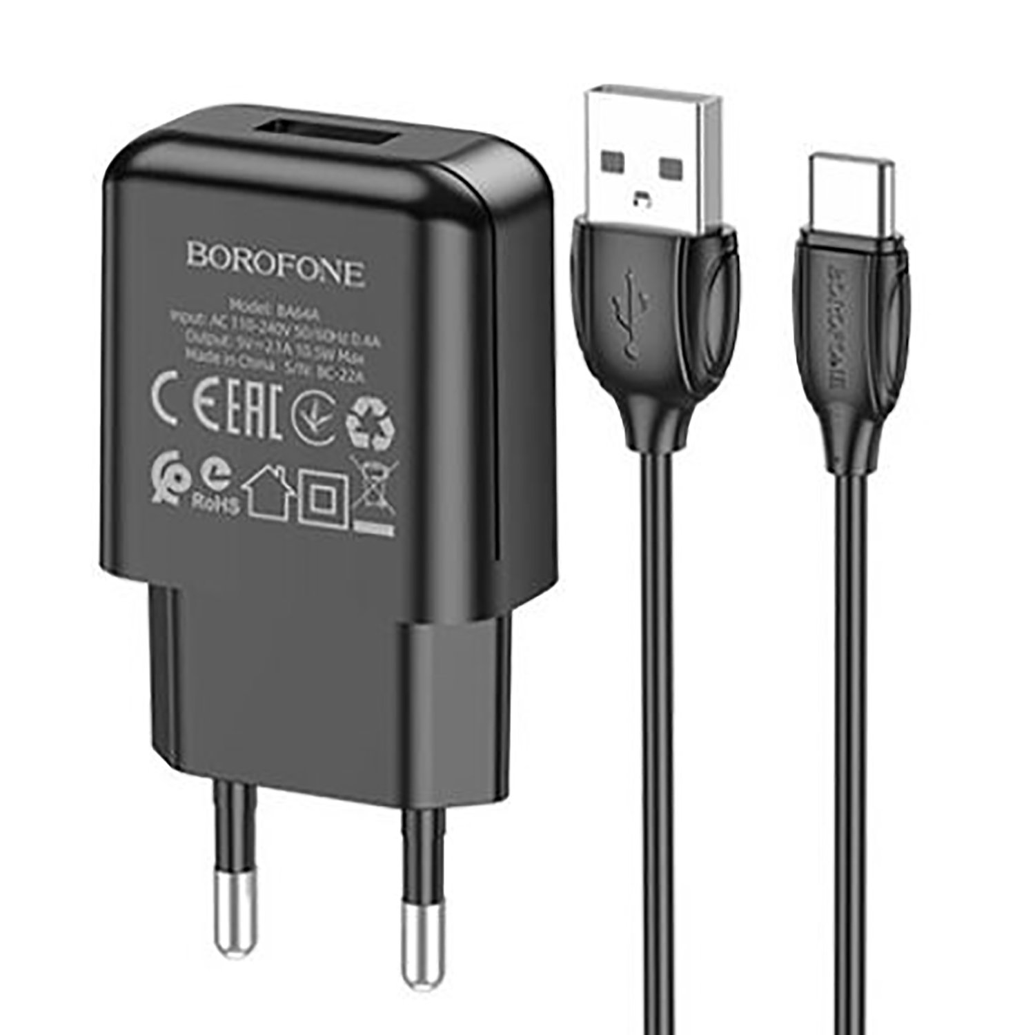 Адаптер Сетевой с кабелем Borofone BA64A USB 2,1A/10W (USB/Type-C) (black)