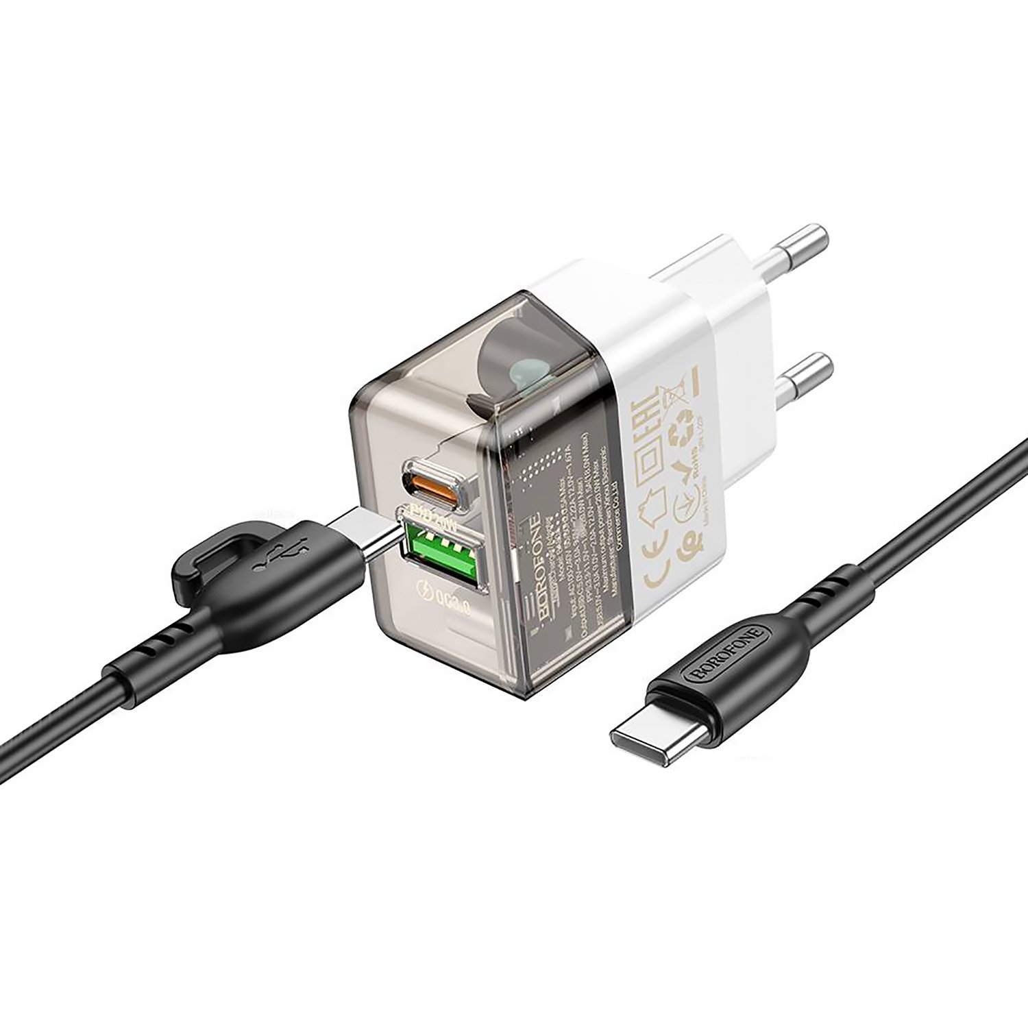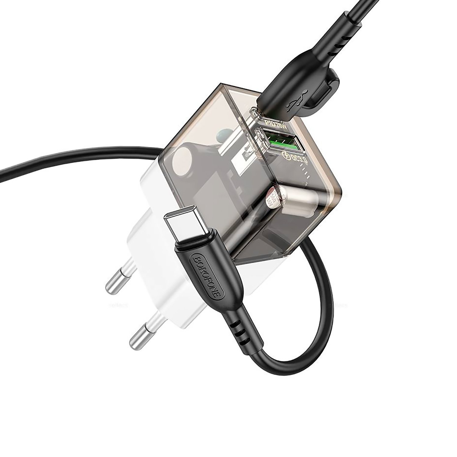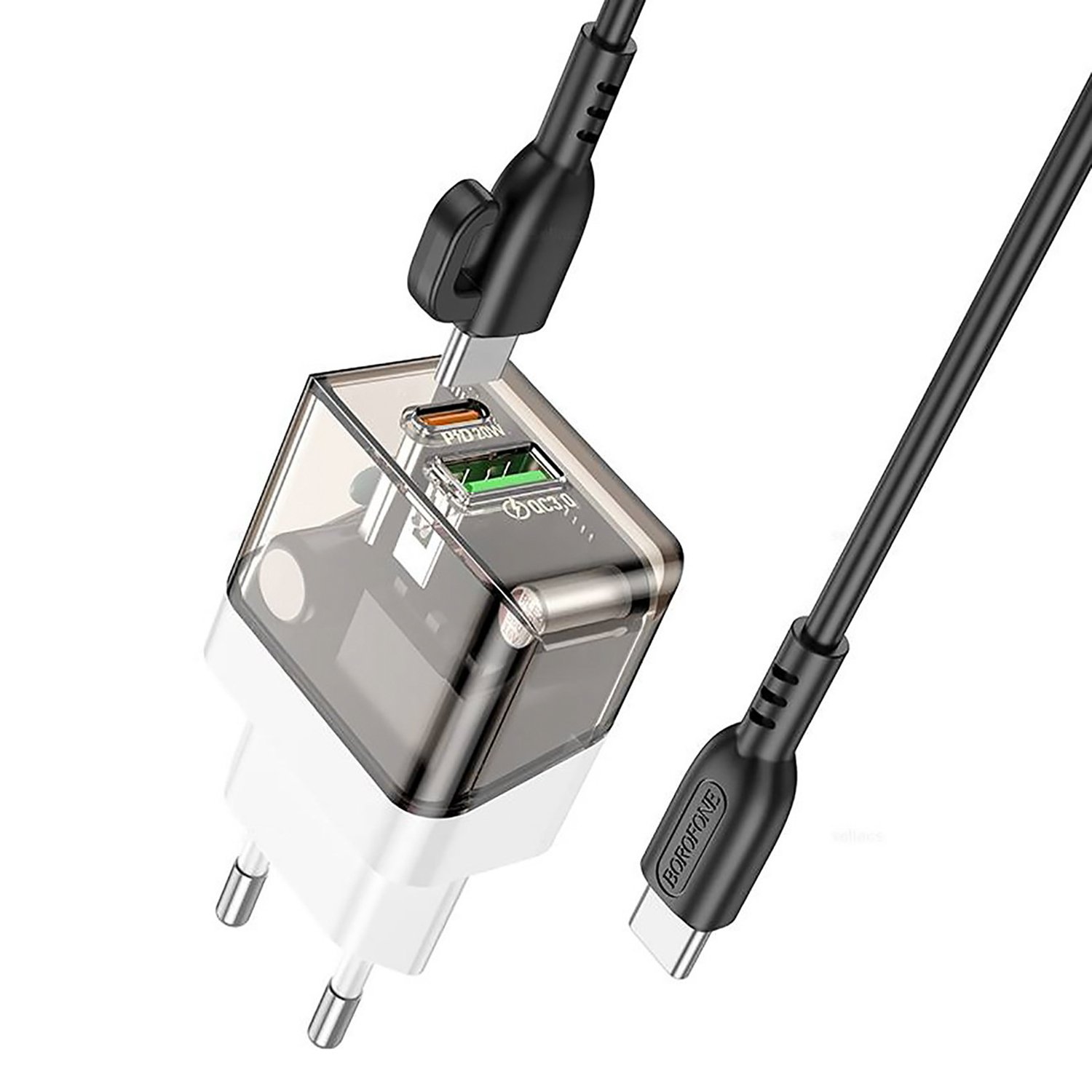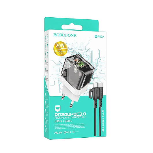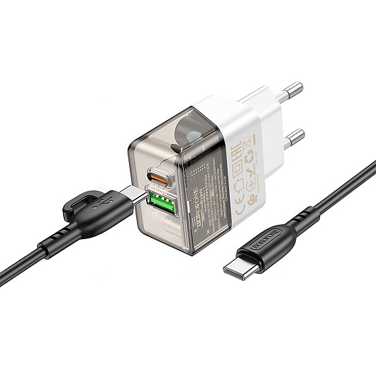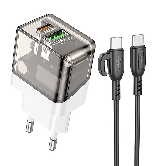 Адаптер Сетевой с кабелем Borofone BA80A Scenery PD+QC USB/Type-C 20W (Type-C/Type-C) (transparent black)