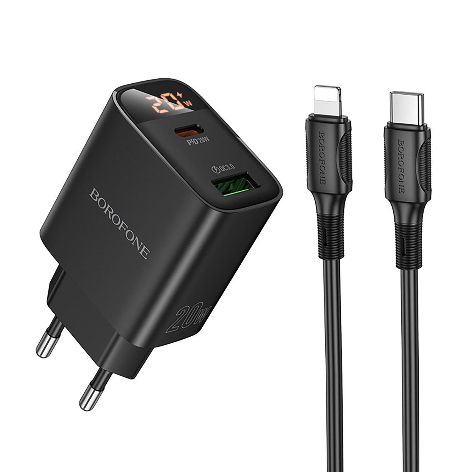 Адаптер Сетевой с кабелем Borofone BA96A Ilustre PD+QC3.0 USB/Type-C 3A/20W (Type-C/Lightning) (black)