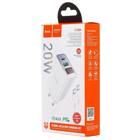 Адаптер Сетевой с кабелем Hoco C100A PD QC3.0 USB/Type-C 20W (Type-C/Type-C) (white)