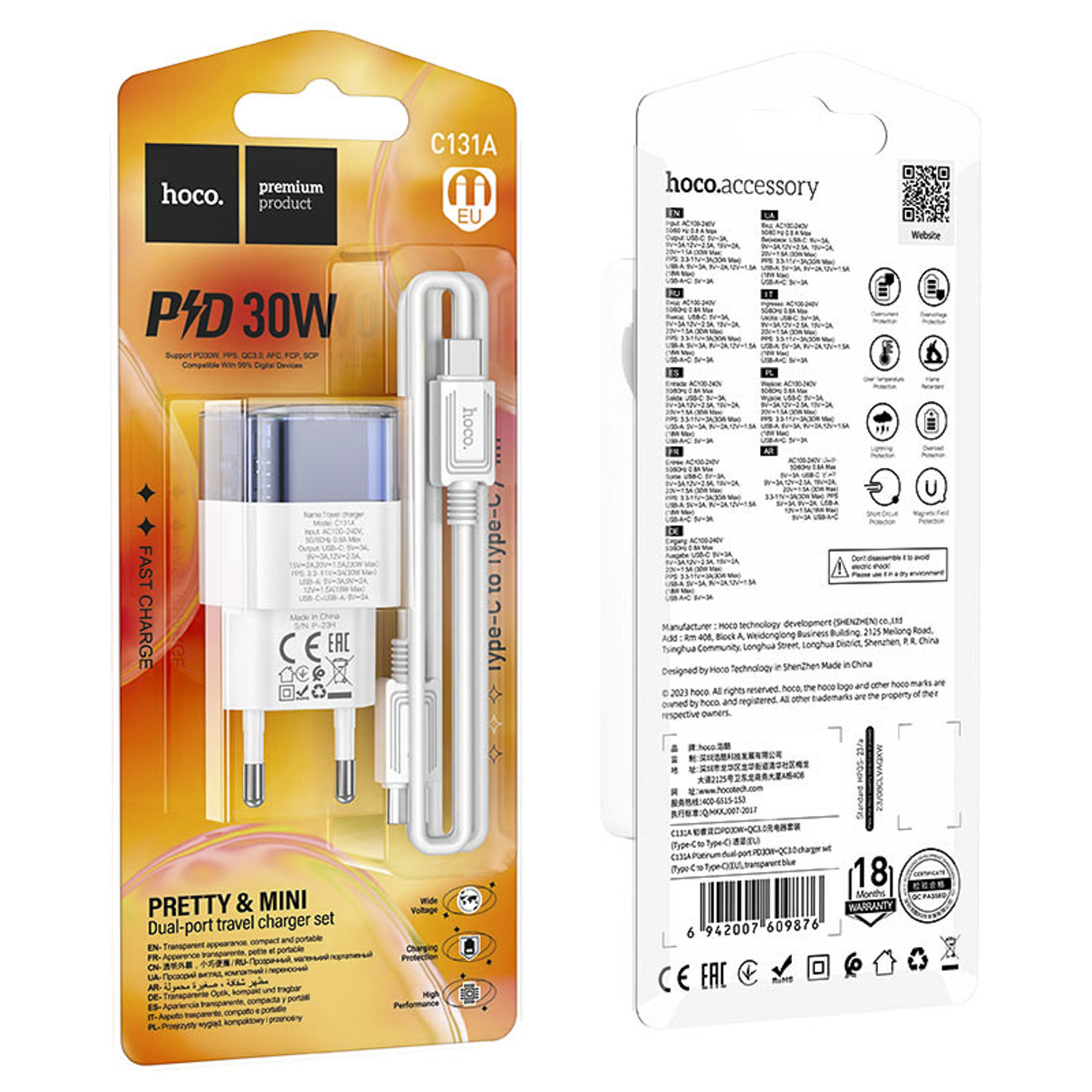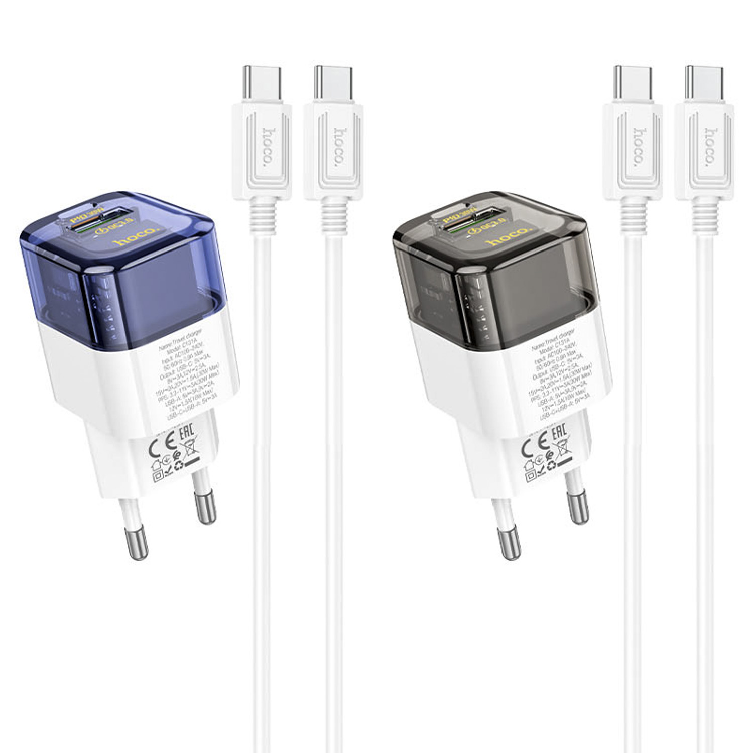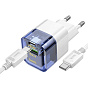 Адаптер Сетевой с кабелем Hoco C131a PD USB/Type-C 30W (Type-C/Type-C) (transparent blue)