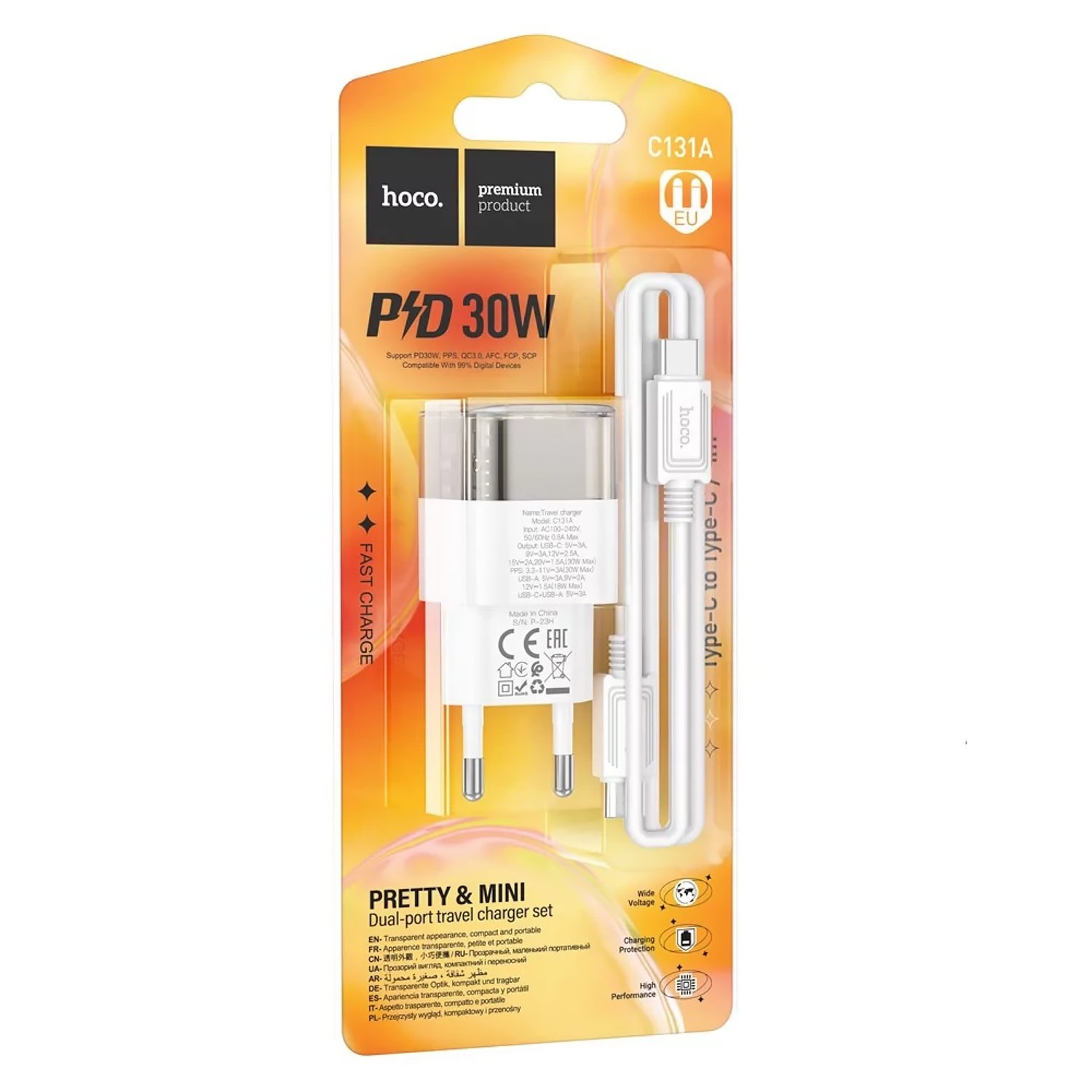 Адаптер Сетевой с кабелем Hoco C131a* USB/Type-C 30W (Type-C/Type-C) (transparent black)