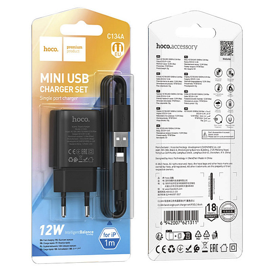 Адаптер Сетевой с кабелем Hoco C134A Solid USB 2,4A/12W (USB/Lightning) (black)