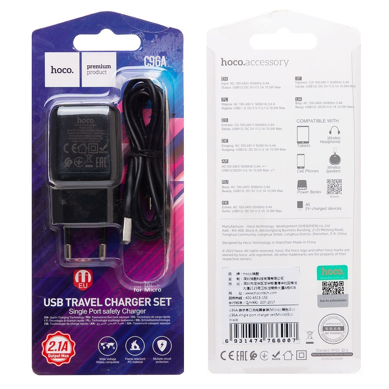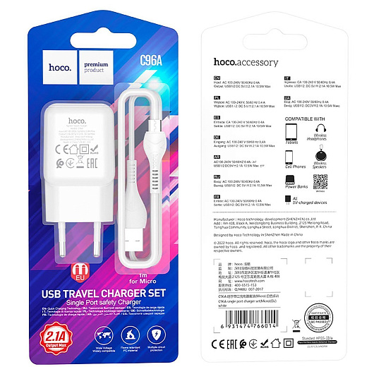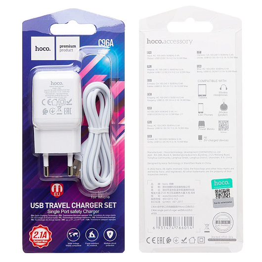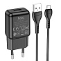 Адаптер Сетевой с кабелем Hoco C96A USB 2,1A/10W (USB/Micro USB) (black)