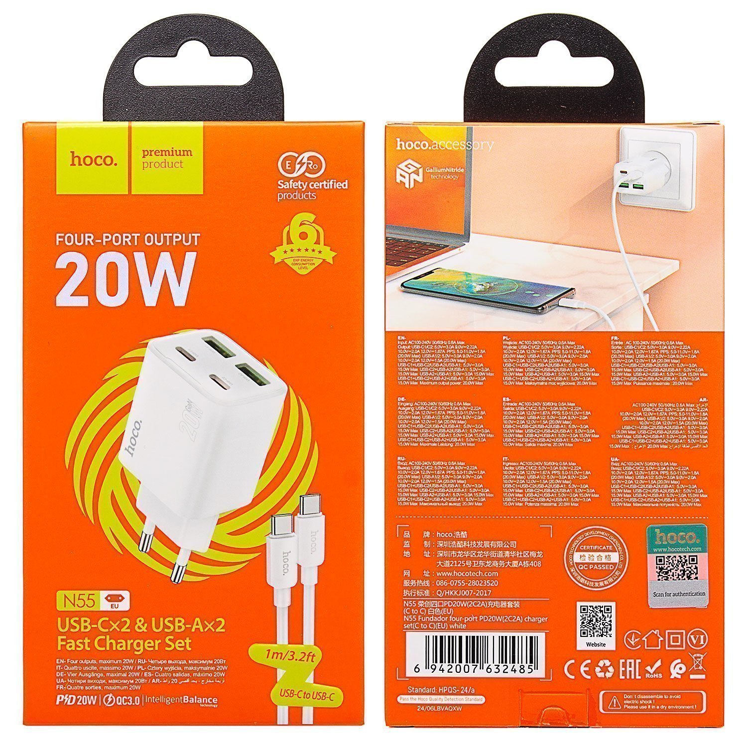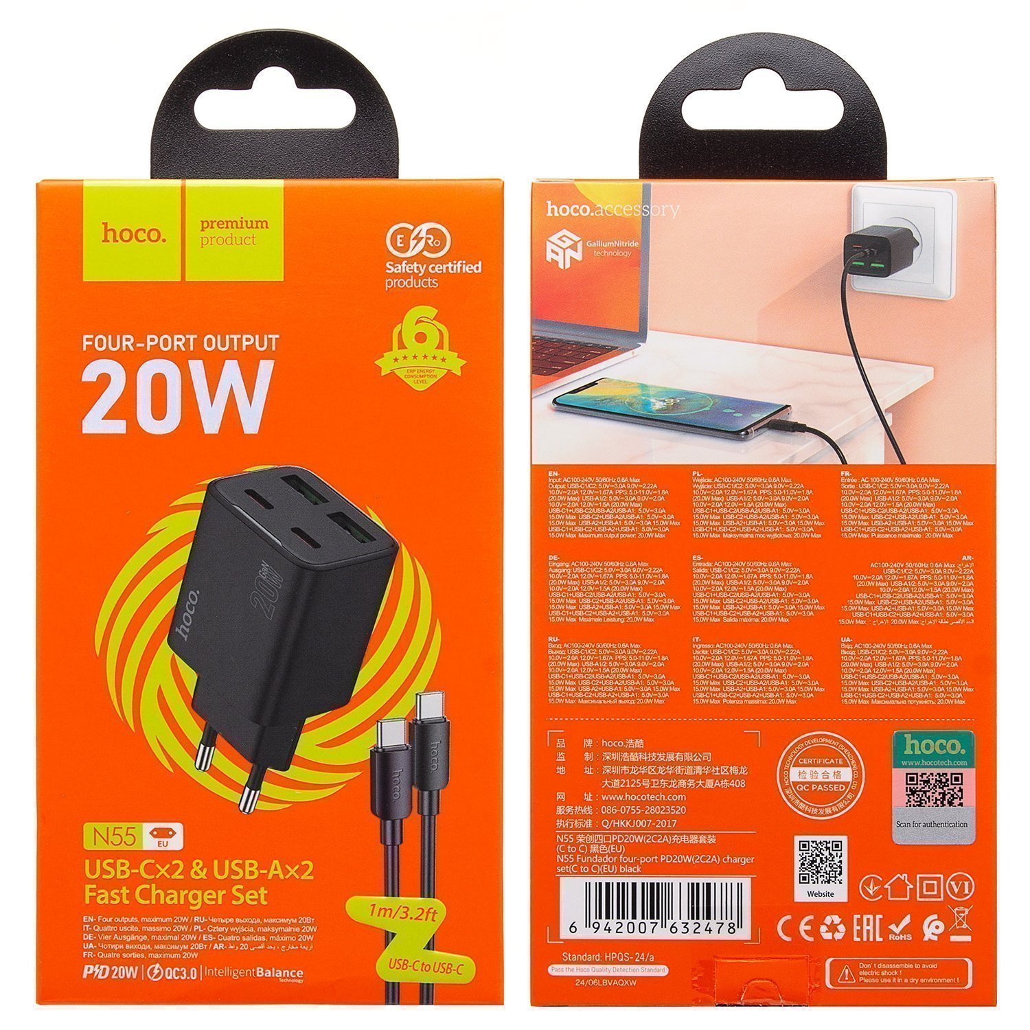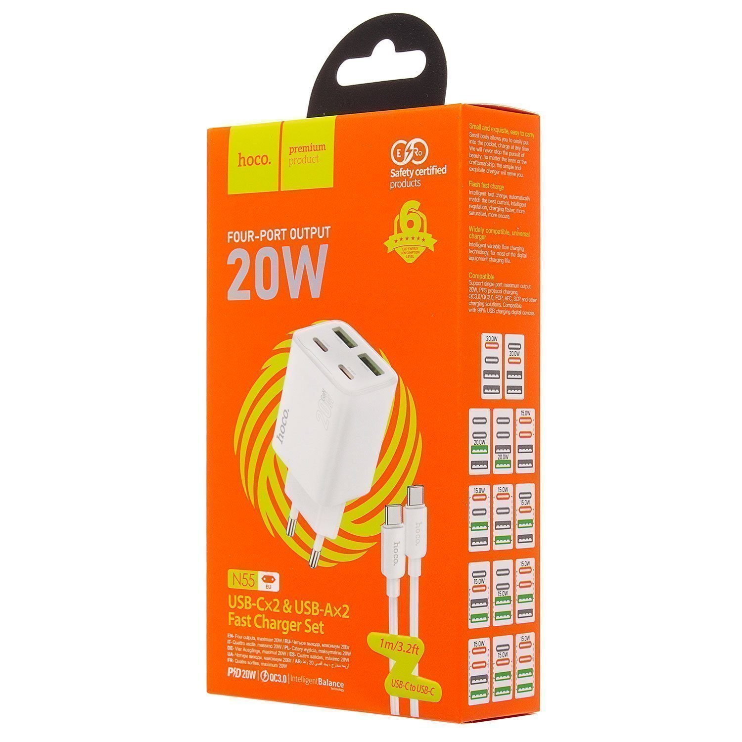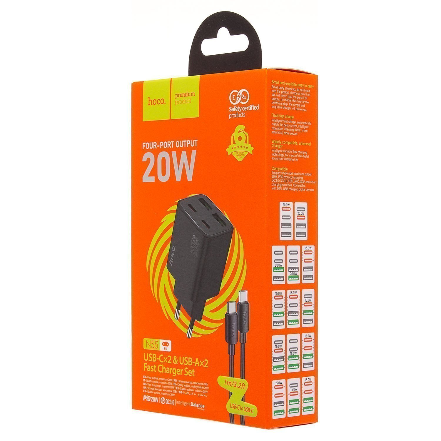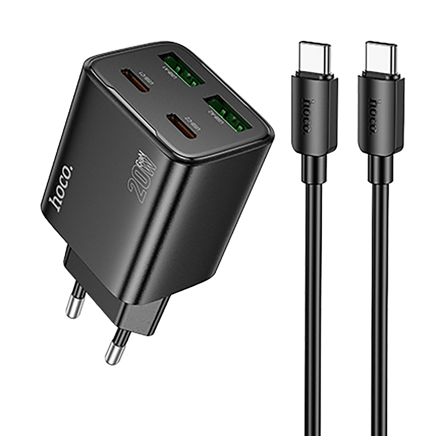 Адаптер Сетевой с кабелем Hoco N55 2Type-C/2USB 3A/20W (Type-C/Type-C) (black)