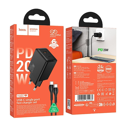 Адаптер Сетевой с кабелем Hoco N68 Nuevo PD Type-C 20W (Type-C/Type-C) (black)