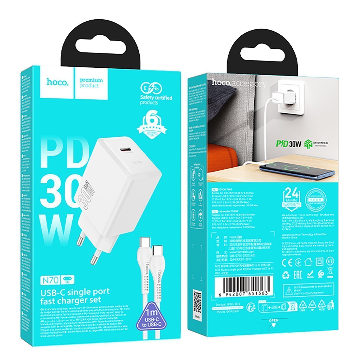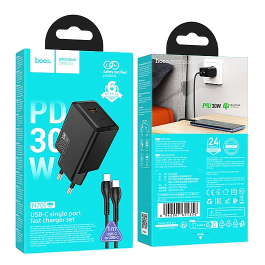 Адаптер Сетевой с кабелем Hoco N70 Nuevo PD Type-C 3A/30W (Type-C/Type-C) (black)