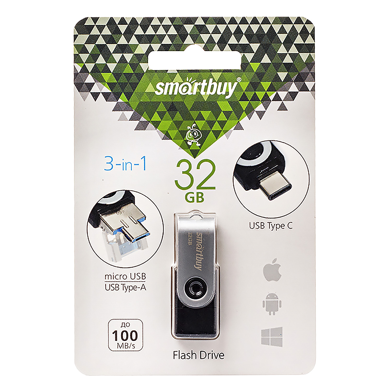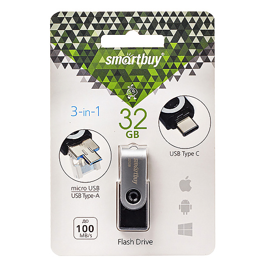 Флэш накопитель USB/MicroUSB 32 Гб Smart Buy Trio 3-in-1 OTG (USB Type-A+USB Type-C+micro USB) (black)