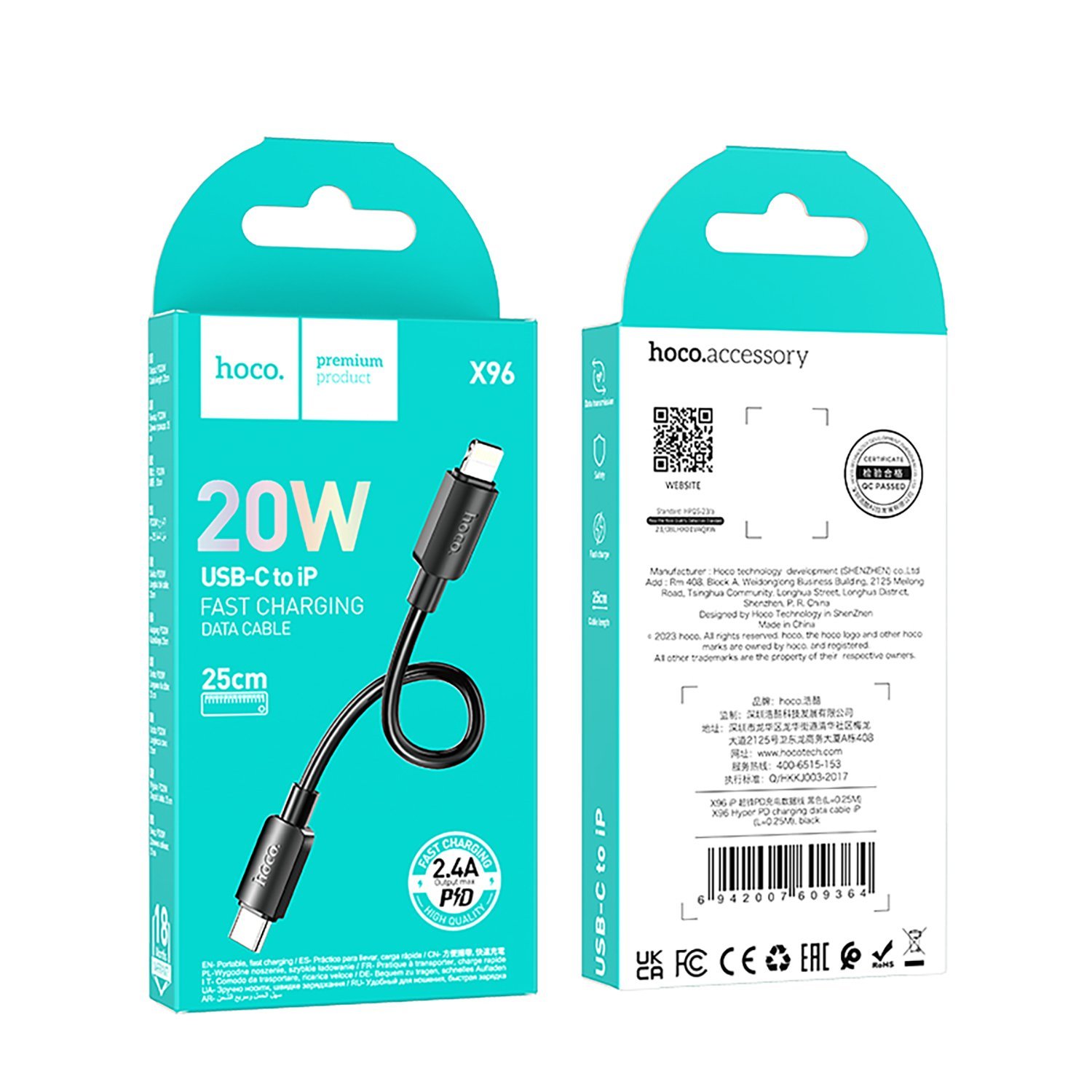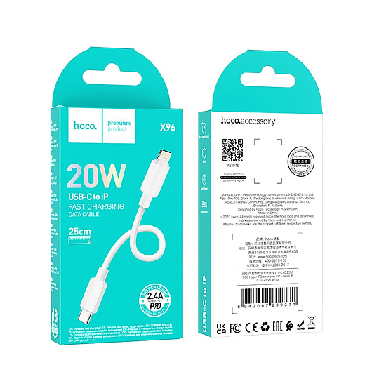 Кабель Type-C - Apple lightning Hoco X96 27W 25см 2,4A (white)