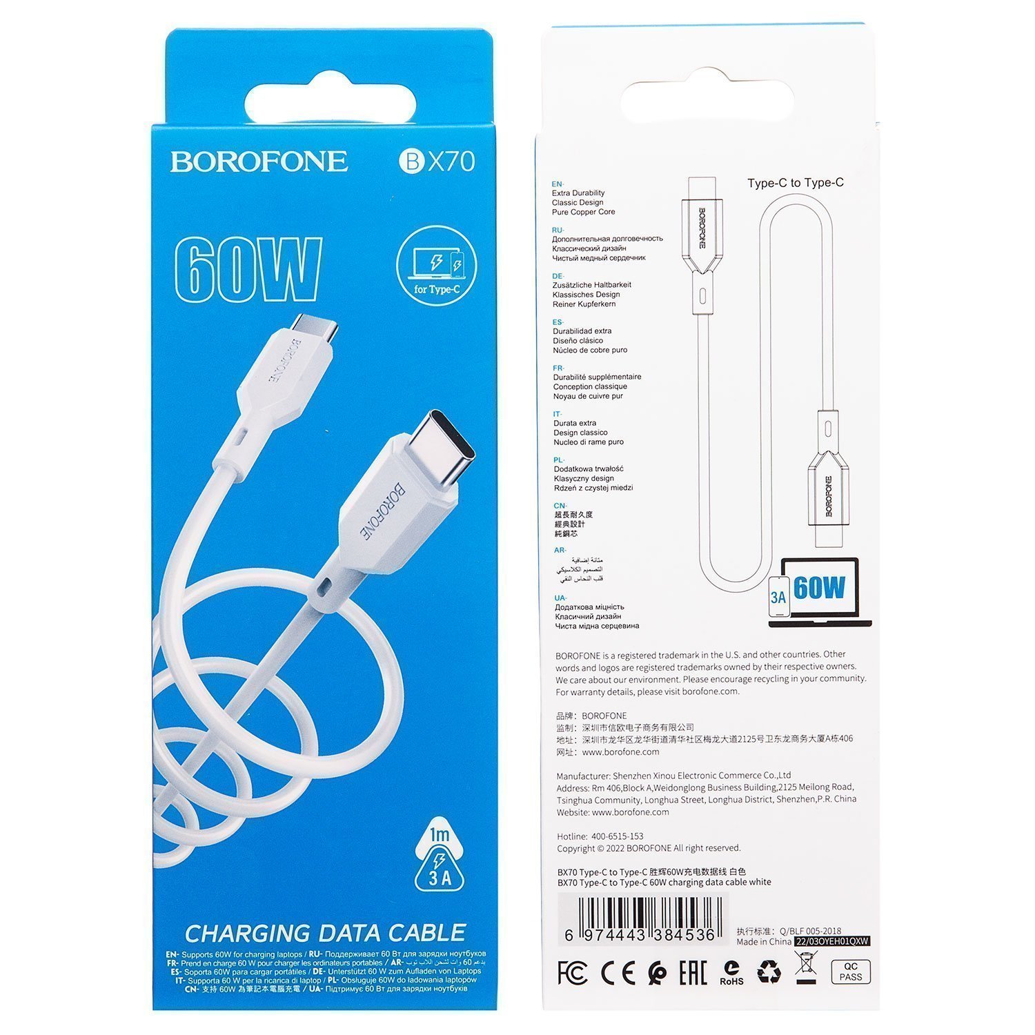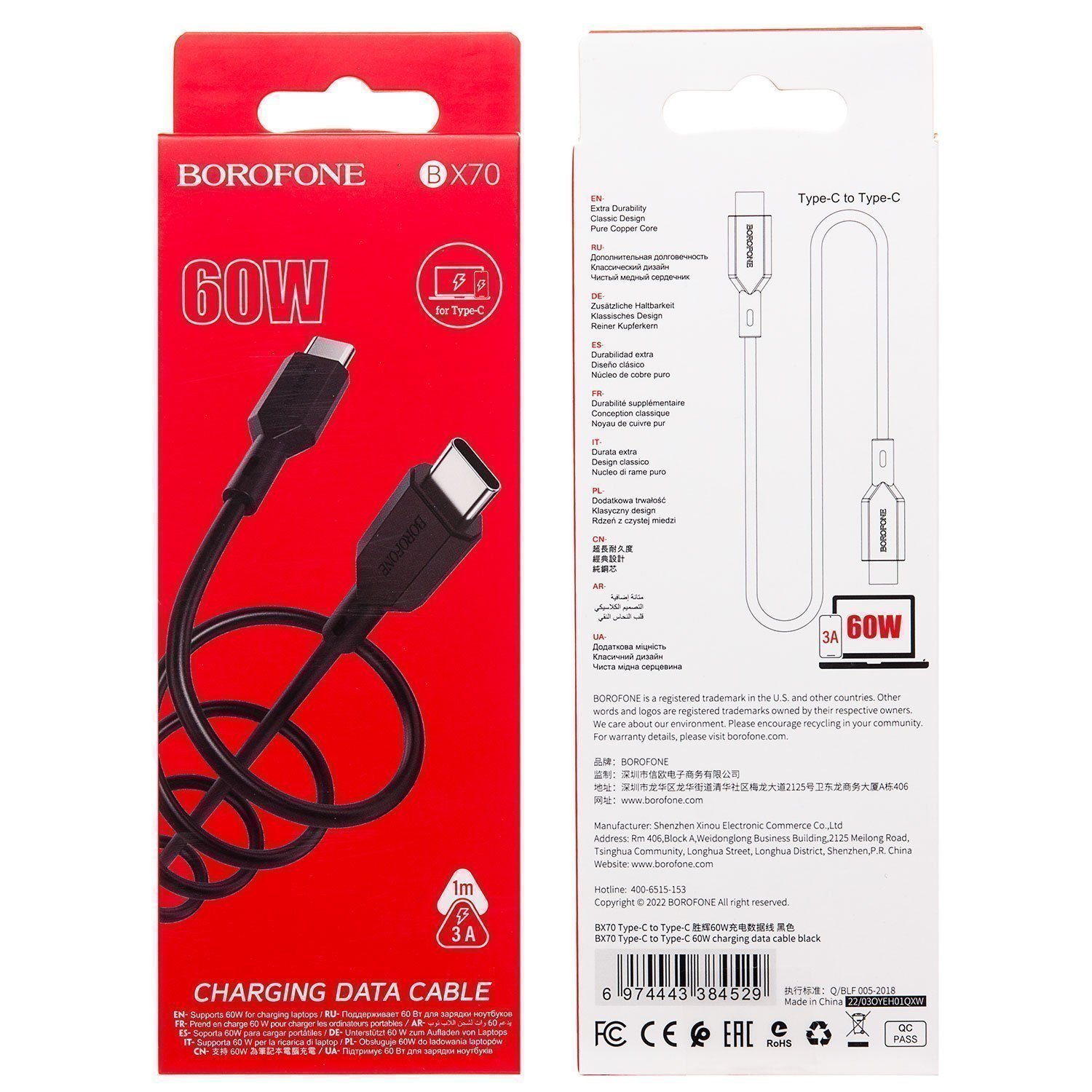 Кабель Type-C - Type-C Borofone BX70 60W 100см 3A (black)