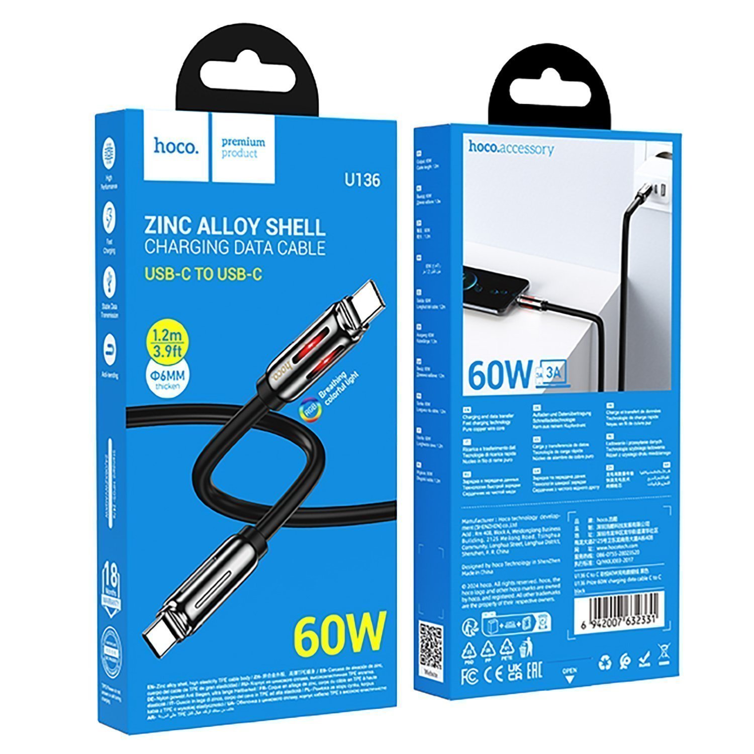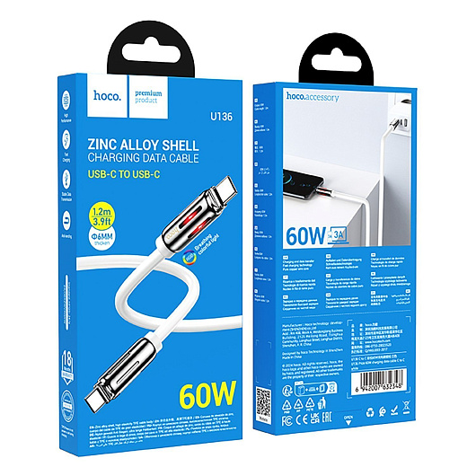 Кабель Type-C - Type-C Hoco U136 Prize PD 60W 100см 3A (white)