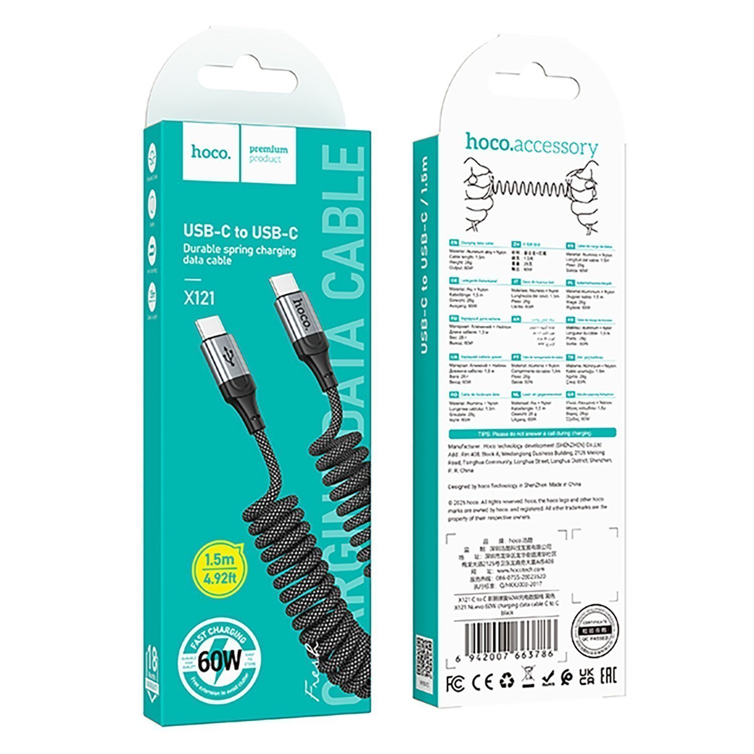 Кабель Type-C - Type-C Hoco X121 Nuevo PD пружина 60W 150см 3A (black)