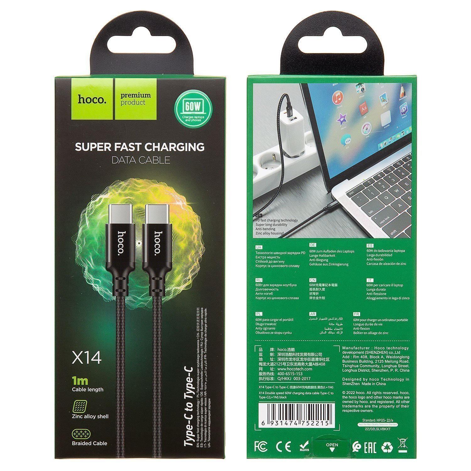 Кабель Type-C - Type-C Hoco X14 Double speed 60W 100см 3A (black)