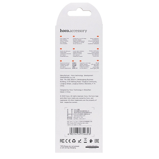 Кабель Type-C - Type-C Hoco X66 60W 100см 3A (gray)