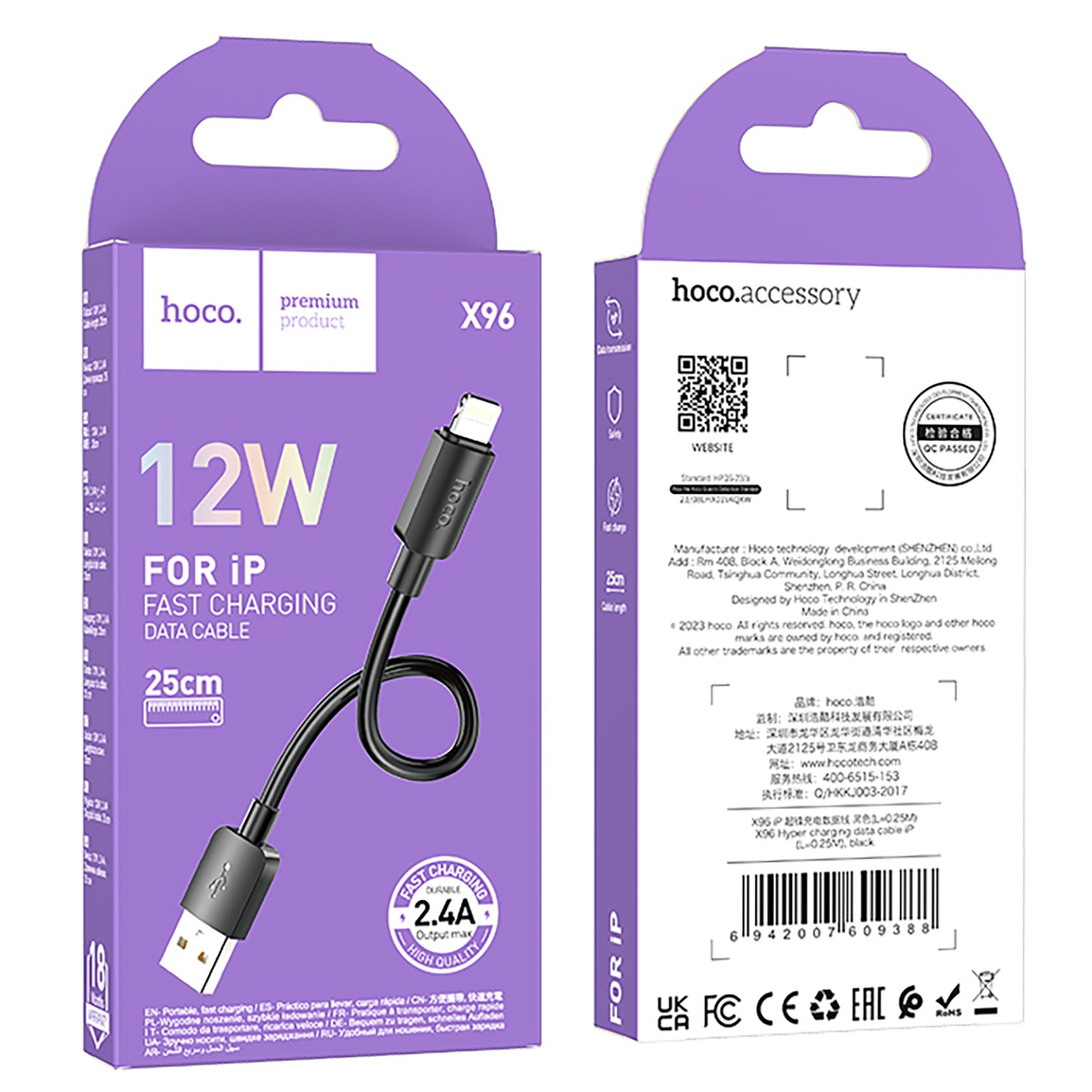 Кабель USB - Apple lightning Hoco X96 12W 25см 2,4A (black)