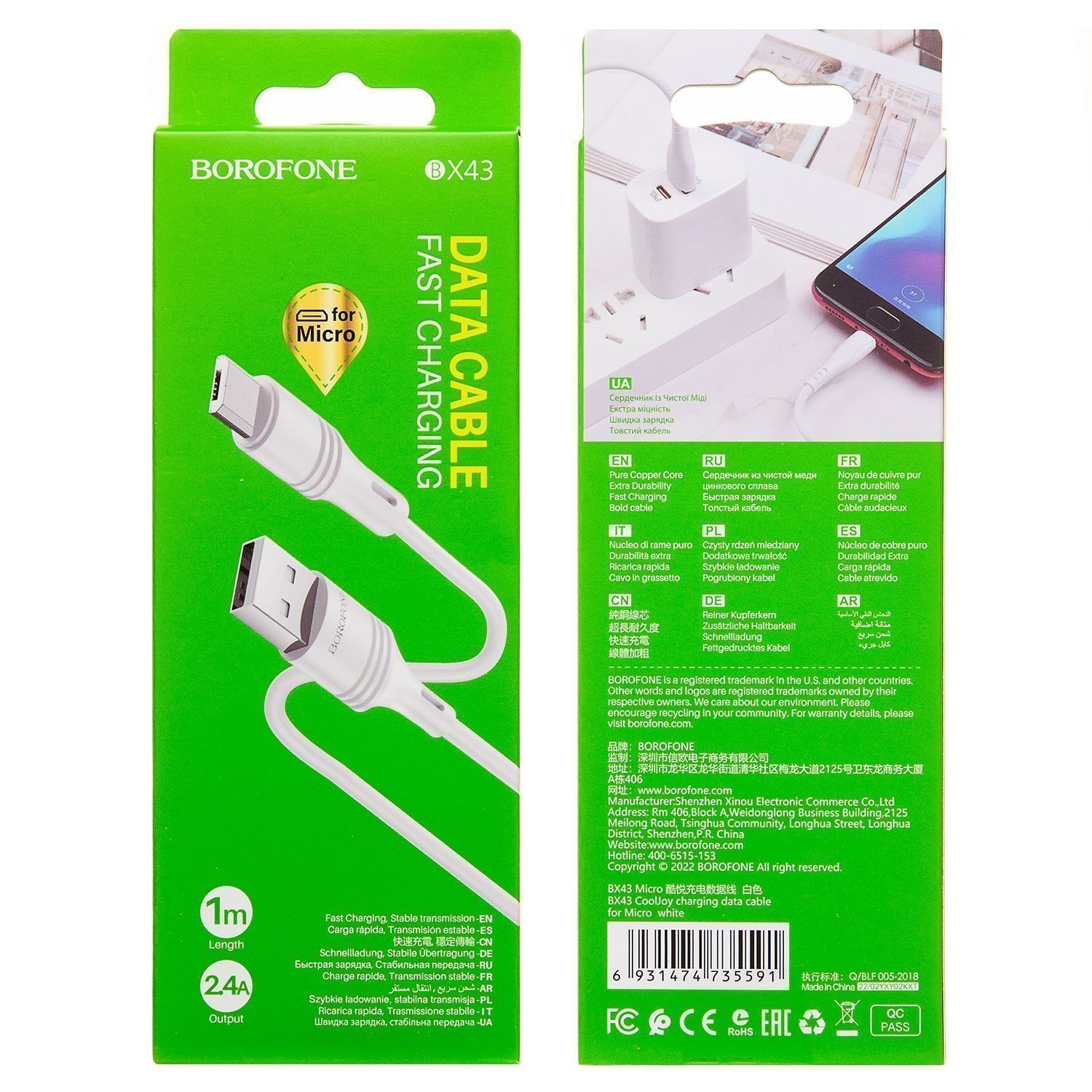Кабель USB - micro USB Borofone BX43 CoolJoy 12W 100см 2,4A (white)