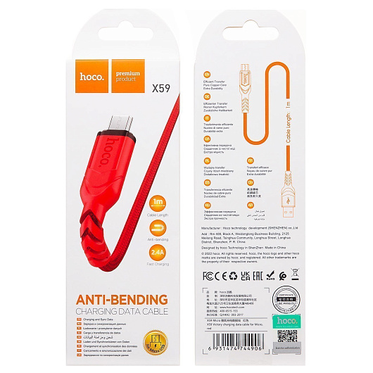 Кабель USB - micro USB Hoco X59 Victory PD 12W 100см 2,4A (red)