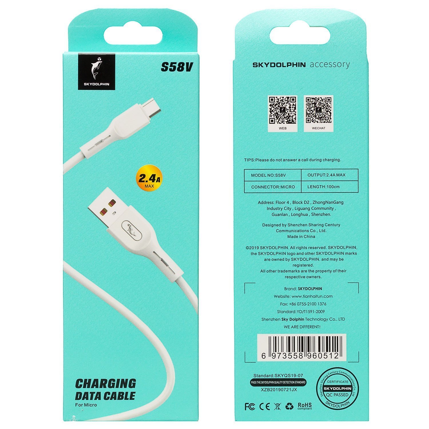 Кабель USB - micro USB SKYDOLPHIN S58V 12W 100см 2,4A (white)