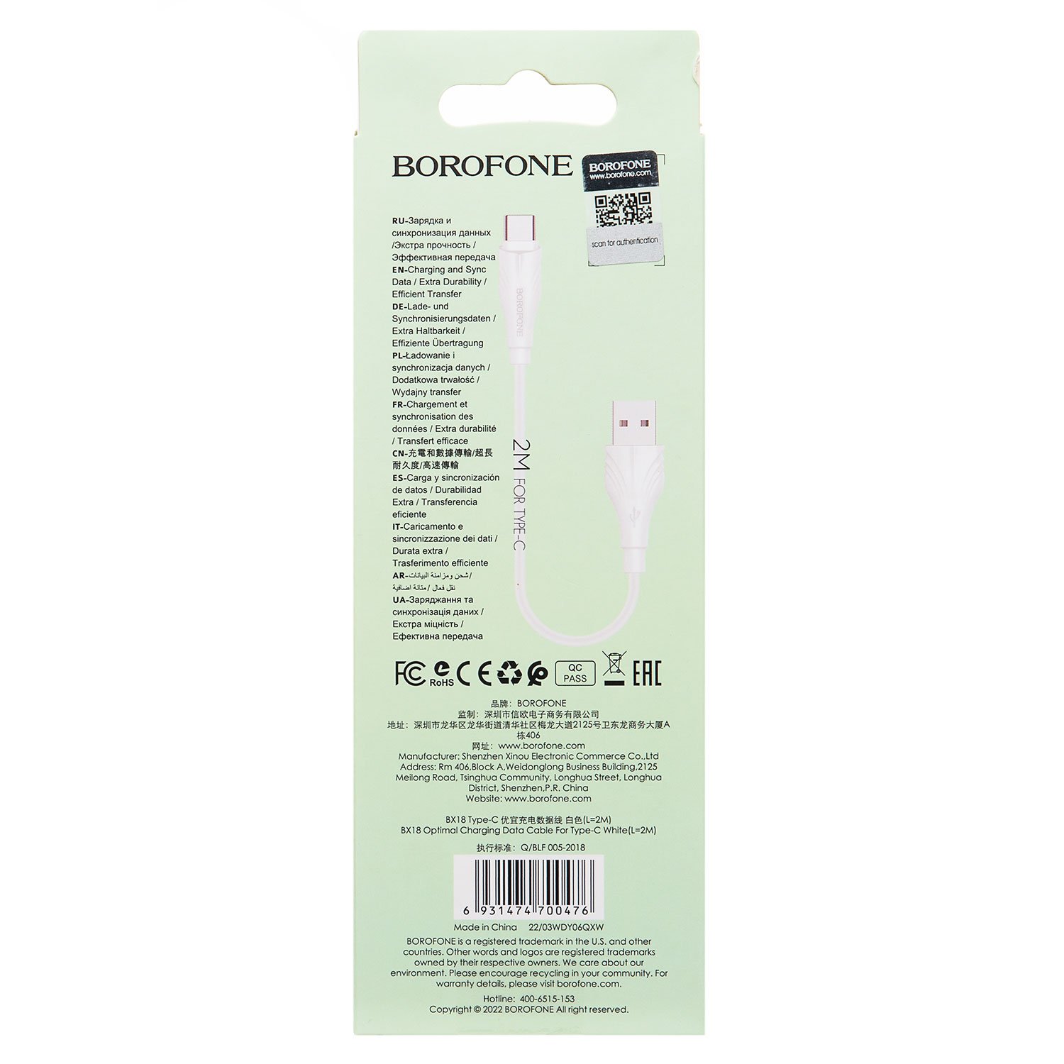 Кабель USB - Type-C Borofone BX18 18W 200см 3A (white)