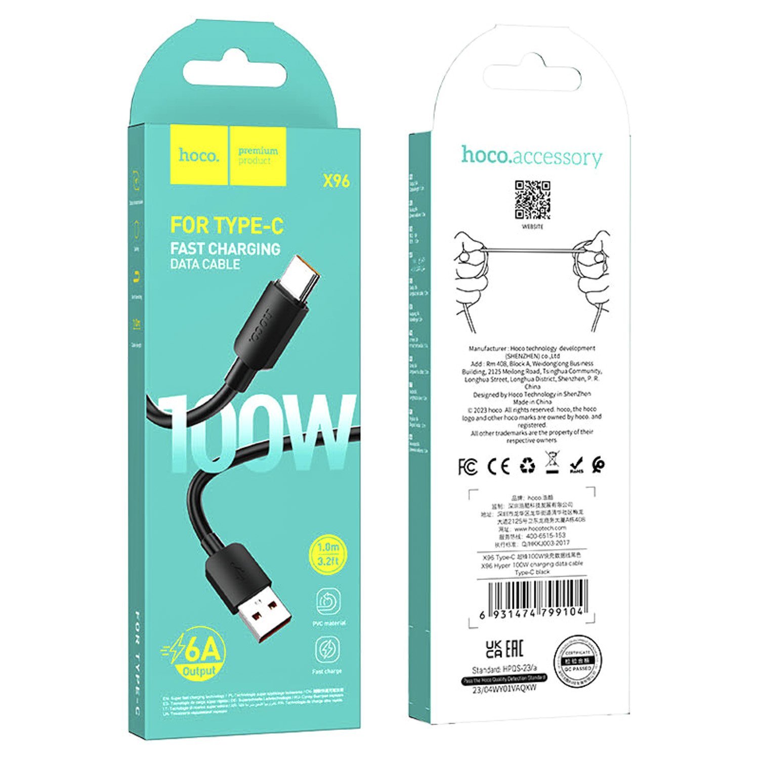Кабель USB - Type-C Hoco X96 100W 25см 6A (black)