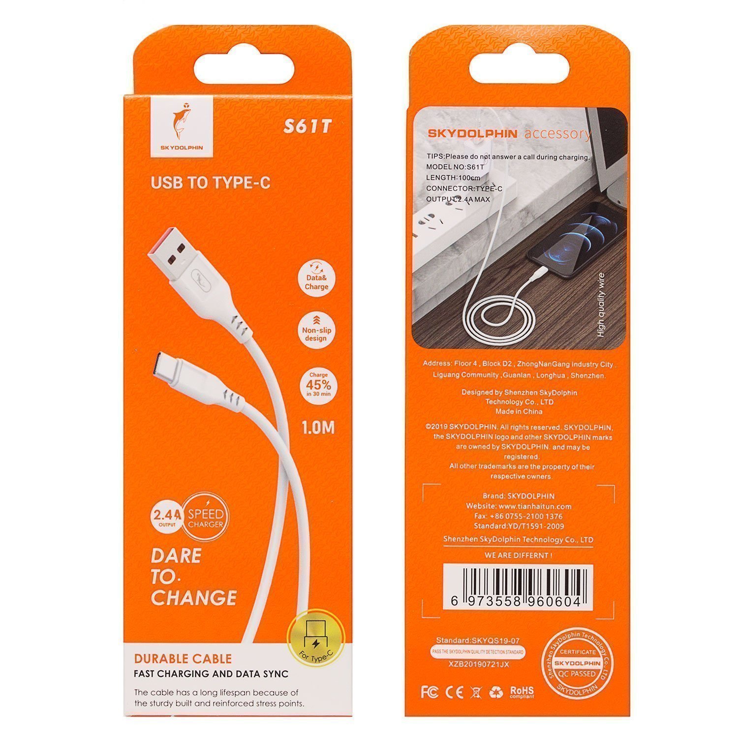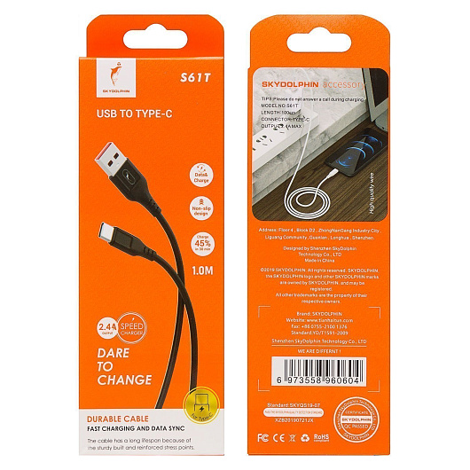 Кабель USB - Type-C SKYDOLPHIN S61T 12W 100см 2,4A (black)