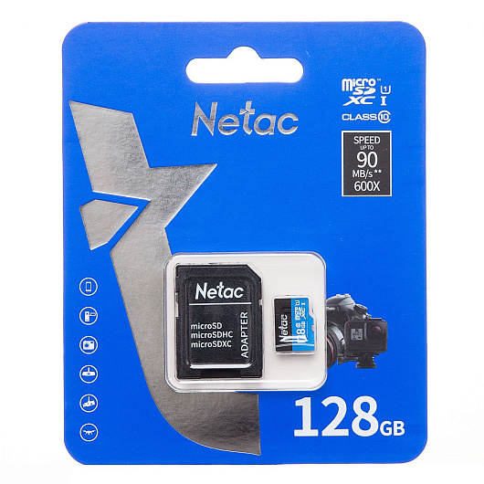Карта флэш-памяти MicroSD 128 Гб Netac P500 Standard UHS-I (90 Mb/s) + SD адаптер (Class 10)