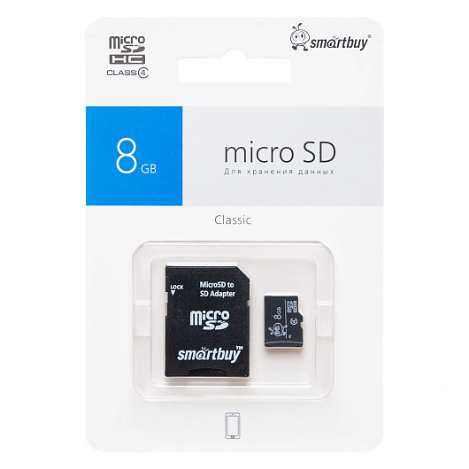Карта флэш-памяти MicroSD 8 Гб Smart Buy +SD адаптер (class 4)