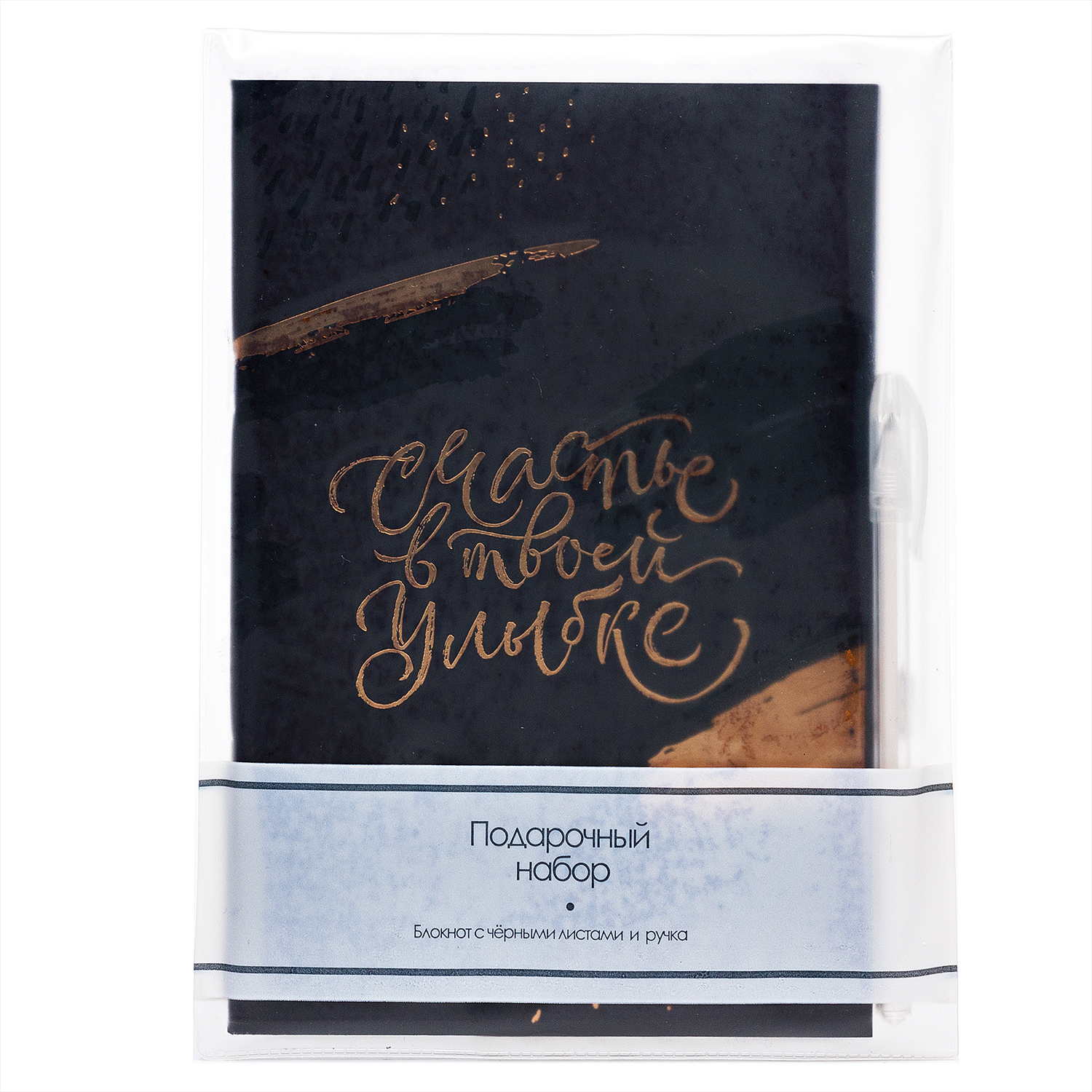 Набор - "Счастье в твоей улыбке" блокнот с чёрными листами и ручка с белыми чернилами (black)