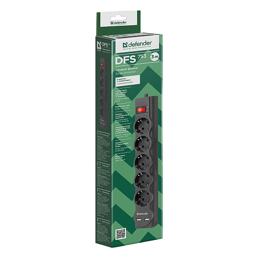 Сетевой фильтр Defender DFS 753, 5 розеток, 3 м (black)