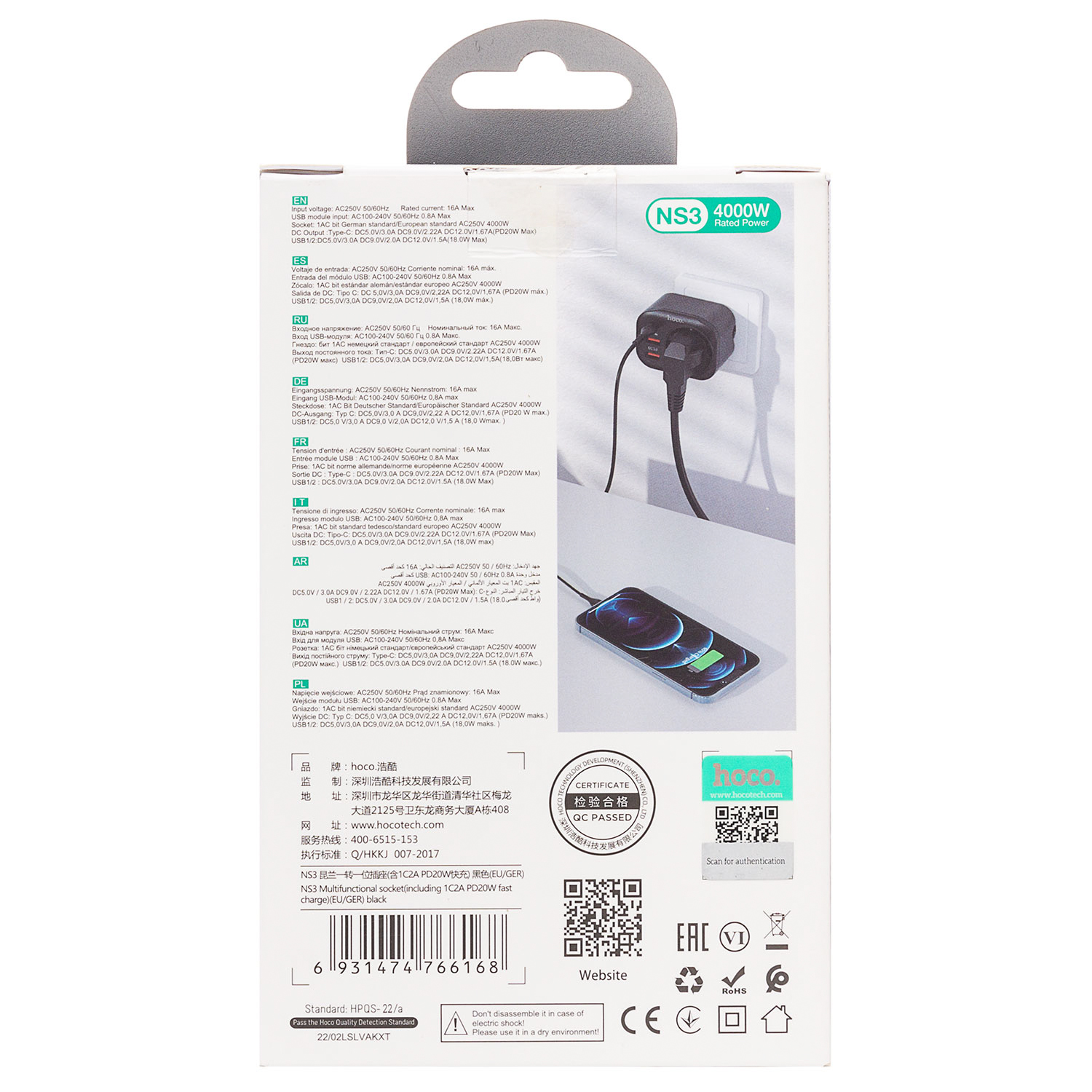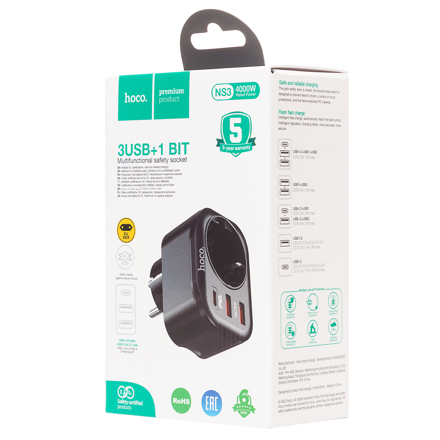 Сетевой фильтр Hoco NS3 Multifunctional socket 2USB/USB-C (розетка) (black)