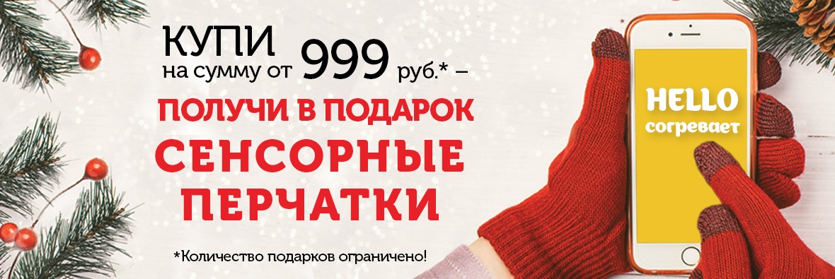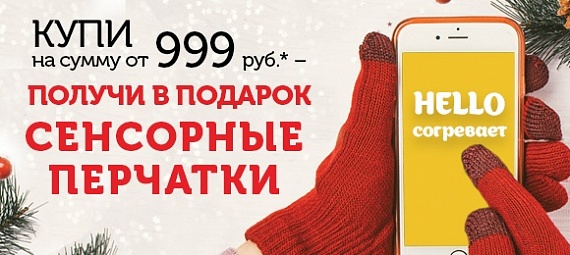 Сенсорные перчатки в подарок!        С 01 по 10 декабря 2018г всем покупателям гипермаркетов HELLO с суммой в чеке от 999 руб.* - в подарок СЕНСОРНЫЕ ПЕРЧАТКИ. * Количество подарков ограничено!